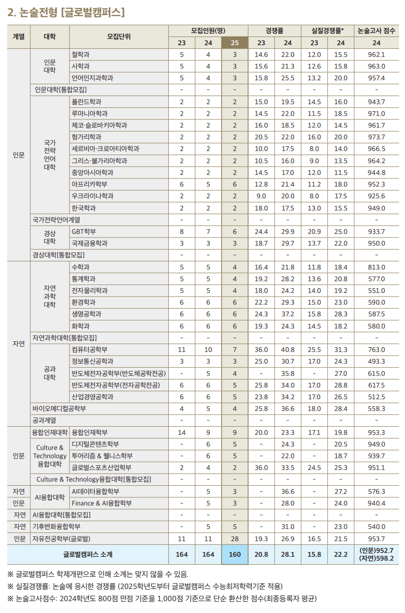 논술전형 최종등록자 평균은 인문계열 952.7점, 자연계열 598.2점이었습니다. 실질경쟁률 평균은 22.2대1로 최초경쟁률과 큰 차이는 없었습니다.