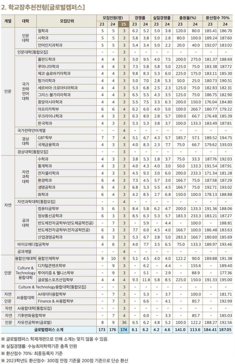 학교장추천전형 최종등록자 70%컷 평균은 187.05점, 경쟁률은 글로벌스포츠산업학부가 11.8대1로 가장 높았습니다. 수능최저통과인원으로 계산한 실질경쟁률 평균은 4.2대1로 최초경쟁률 대비 큰 차이를 보이지는 않았습니다. 다만, 세르비아크로아티아어학과(6.8대1 → 2.3대1) 등 일부 모집단위는 최초경쟁률과 실질경쟁률이 차이가 크게 나탔습니다. 충원율은 폴란드어학과가 275%로 가장 높았습니다.